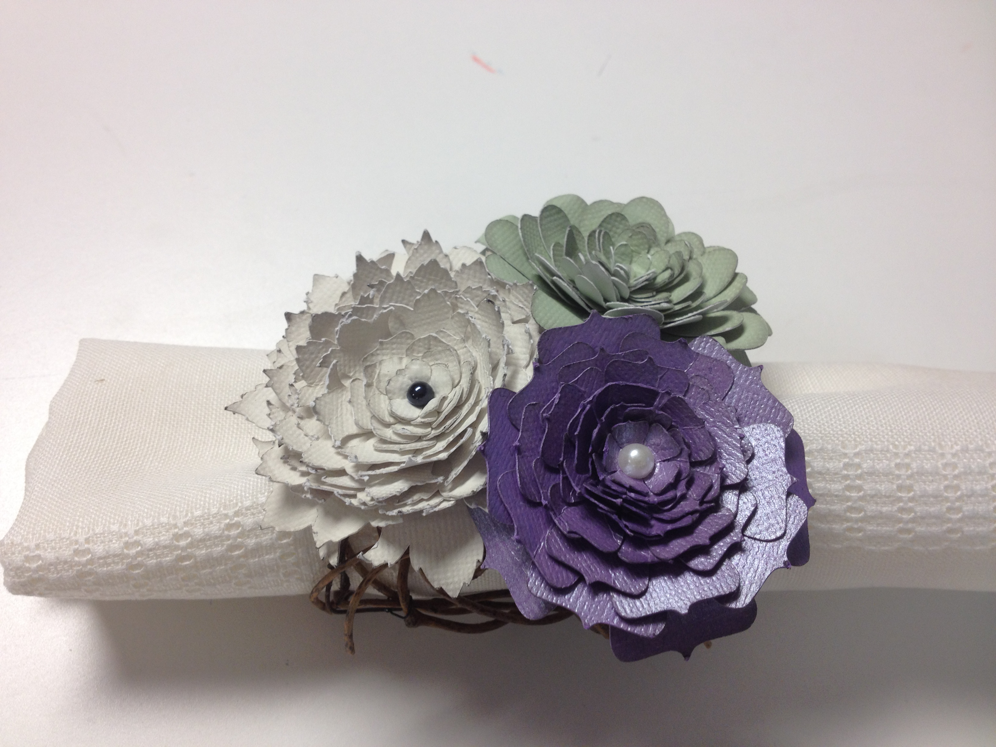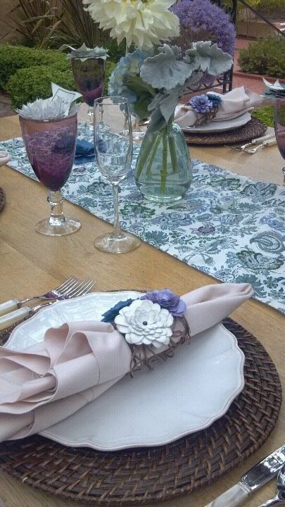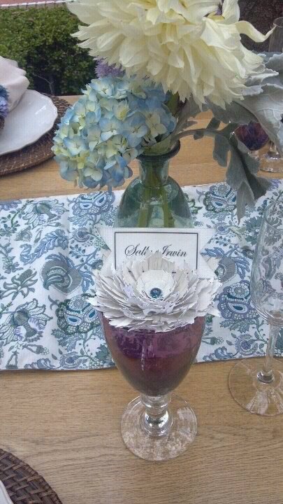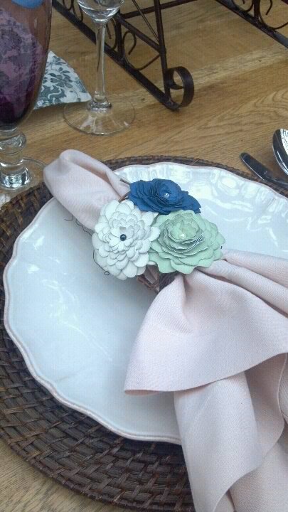 I also created paper flowers for napkin rings and place card holders to coordinate with the floral table theme Erin created. She also did a coral themed table.