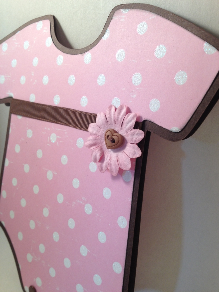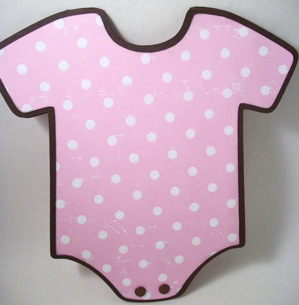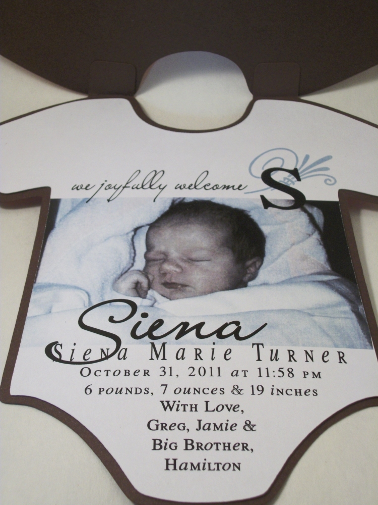 The pink onesie sample flips open to reveal your information inside. Papers, ribbons, and embellishments are all chosen by you. Each piece is approximately 7 1/4″ x 7 1/4″ and comes with a white, square envelope.