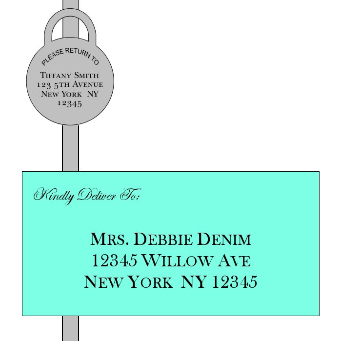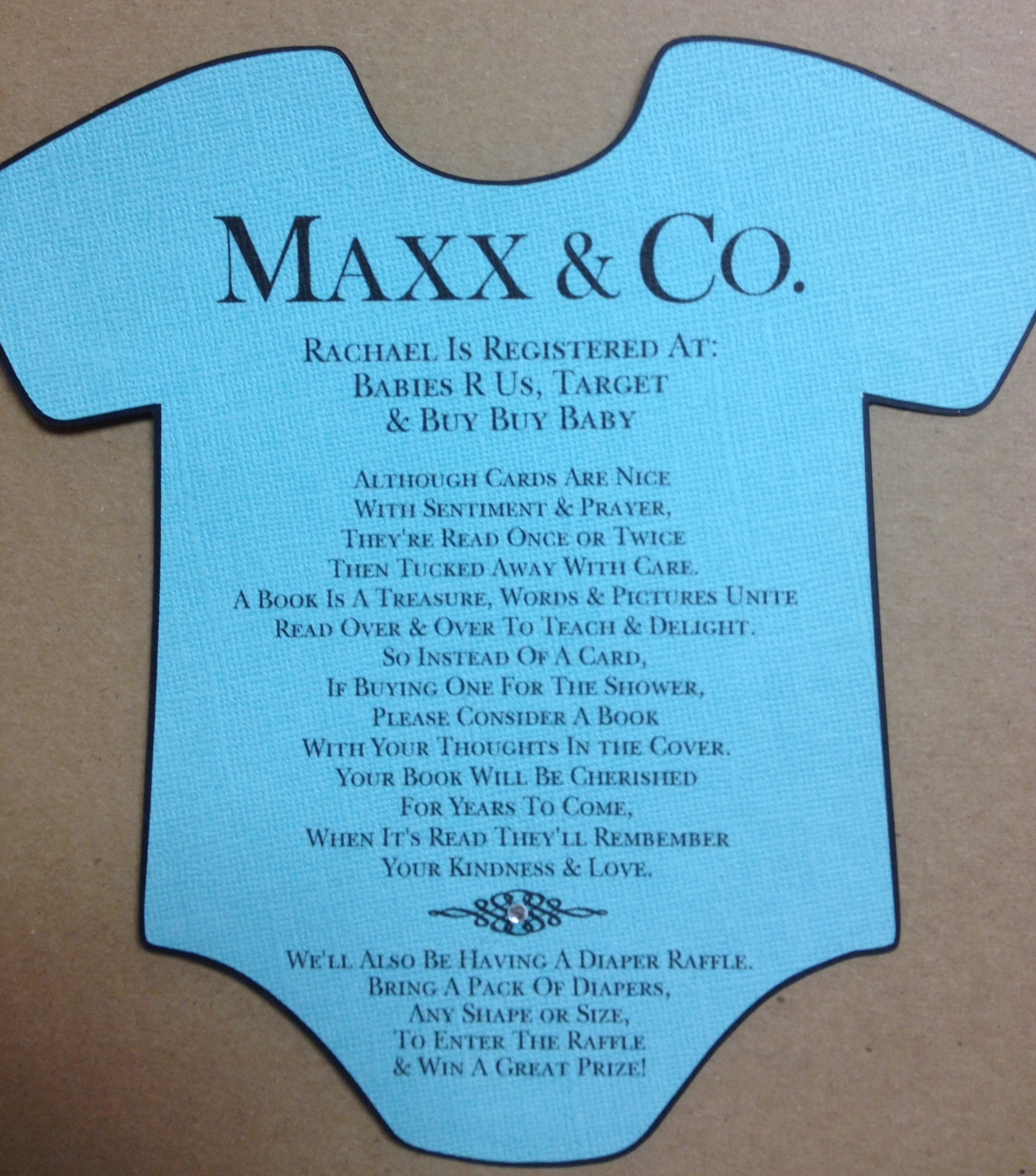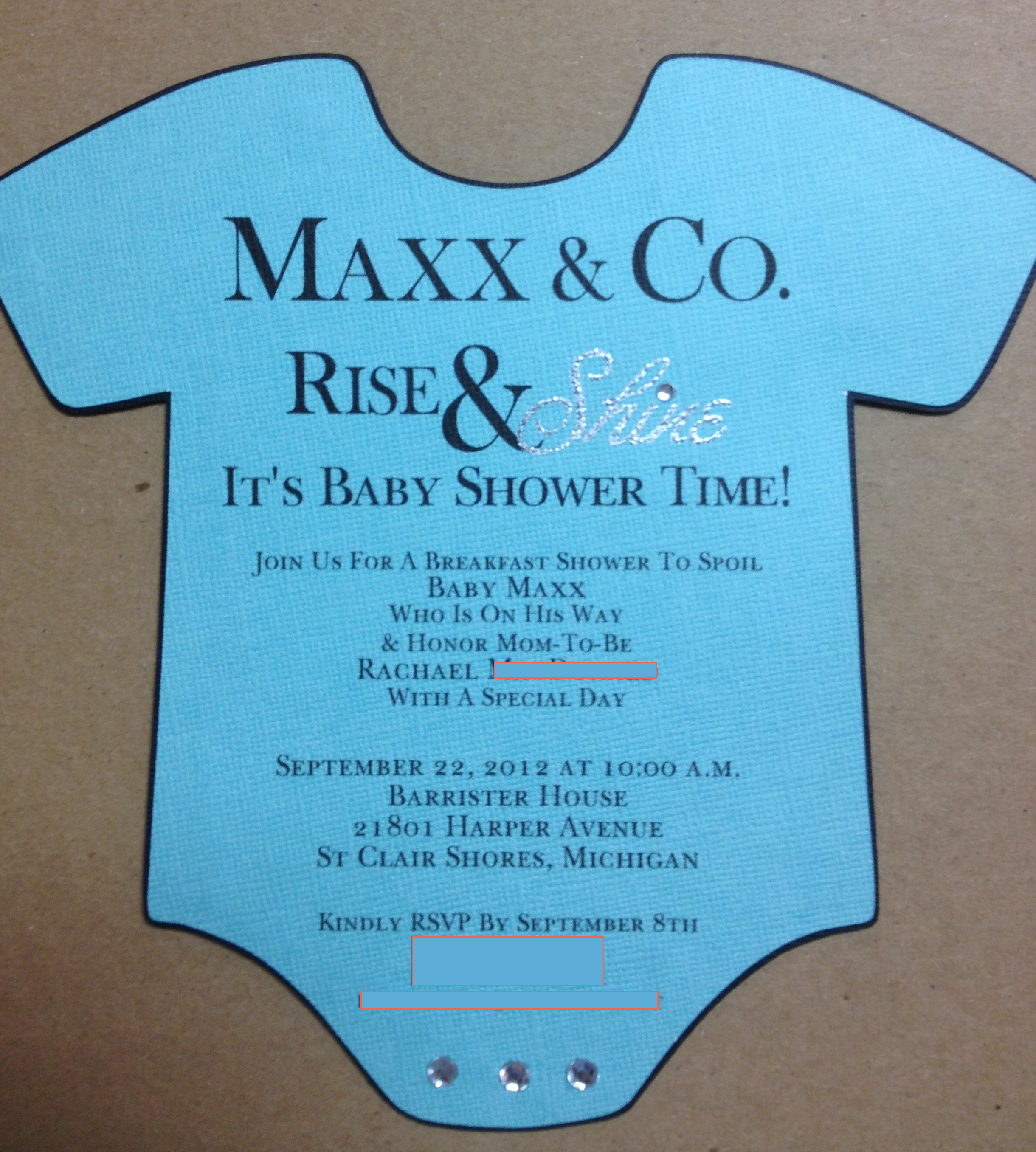 The blue onesie was done for a Tiffany themed baby shower. The information was printed on the front and the back. Crystal gems and embossing was also used. The envelopes were custom printed in the Tiffany motif. Add the coordinating diaper “Thank You” cards to finish your event.