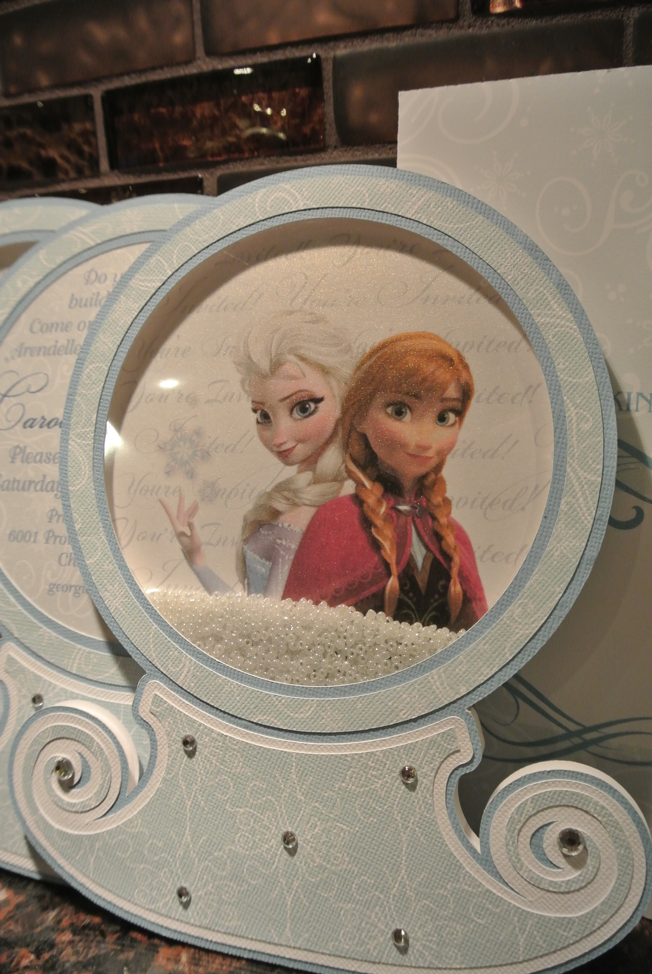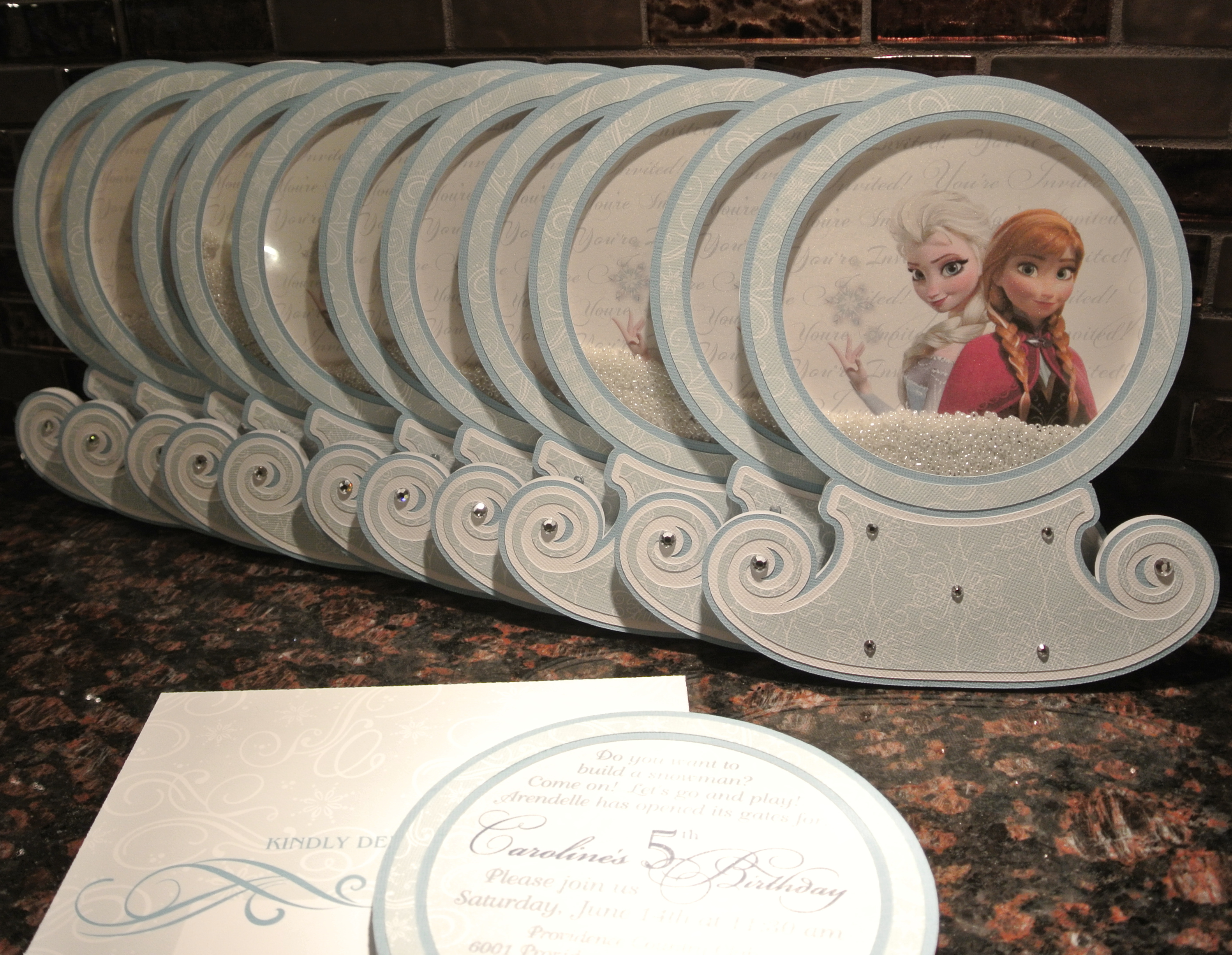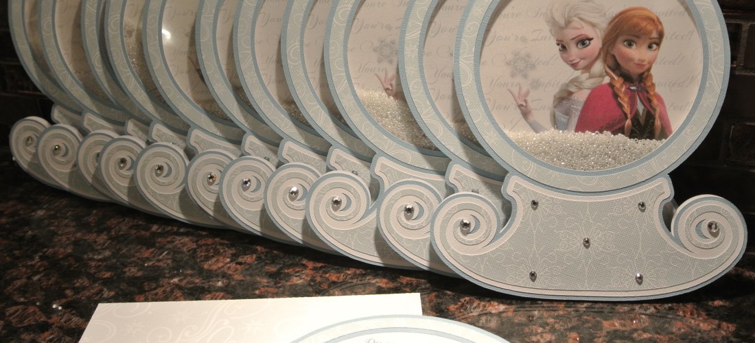 I have a client who has fabulous parties for her kids and comes up with great themes. These invitations and party favors were for her daughter’s very special 5th birthday – a Frozen themed party! Such a great idea for a summer party – to cool things down. Although, when we began the designing and prep for this event, there was still snow on the ground outside of my studio. Boy, how things have changed quickly over the past few months… The invitation was a interactive snow globe – shake the beads inside for snow fun! Flip the invite over and the party information is found on the back. The 3D castle with paper dolls was used as an activity for the young girls to assemble and play with during the party. And of course, everyone needs a snow wand. I made an extra one that I keep on my desk so when my kids get out of hand – a little wave of the wand to “freeze” them.