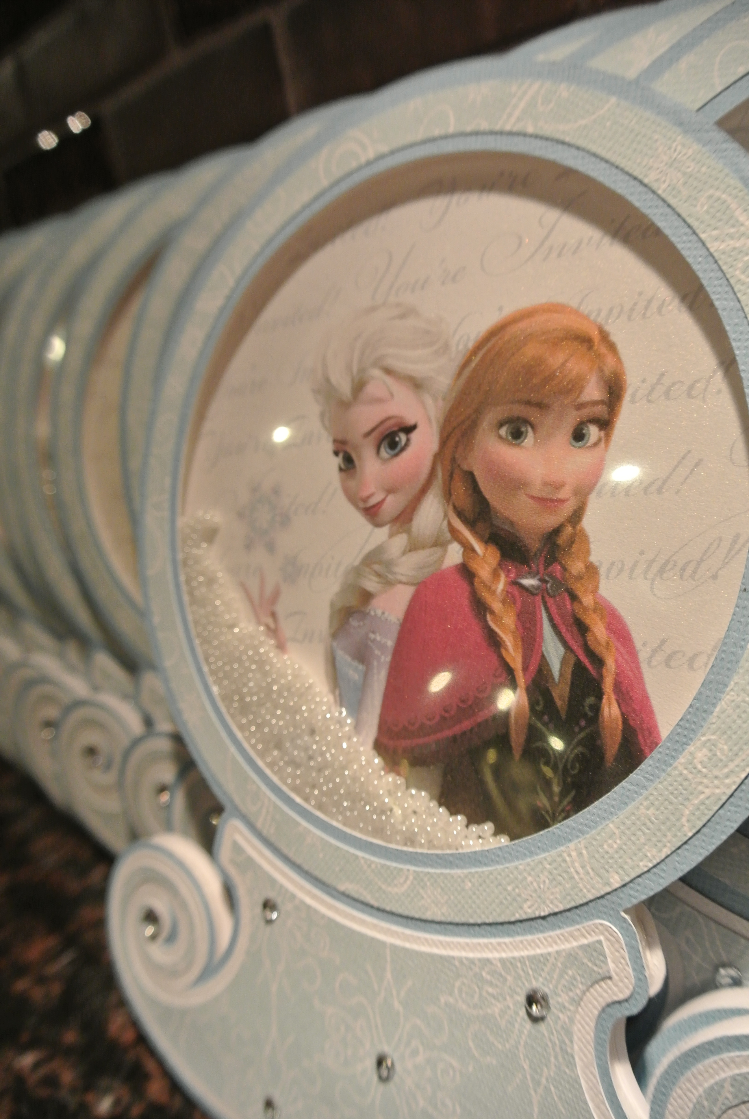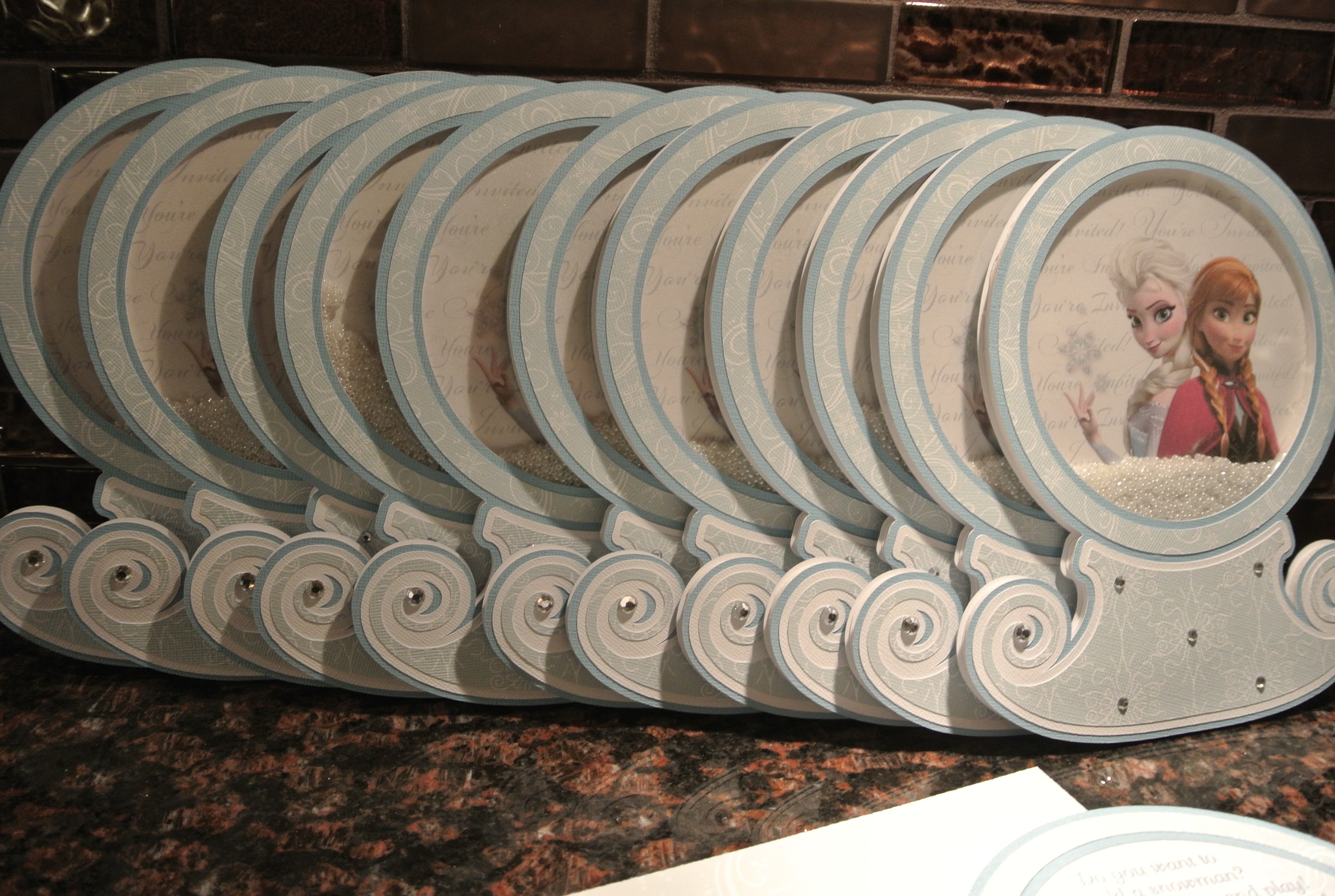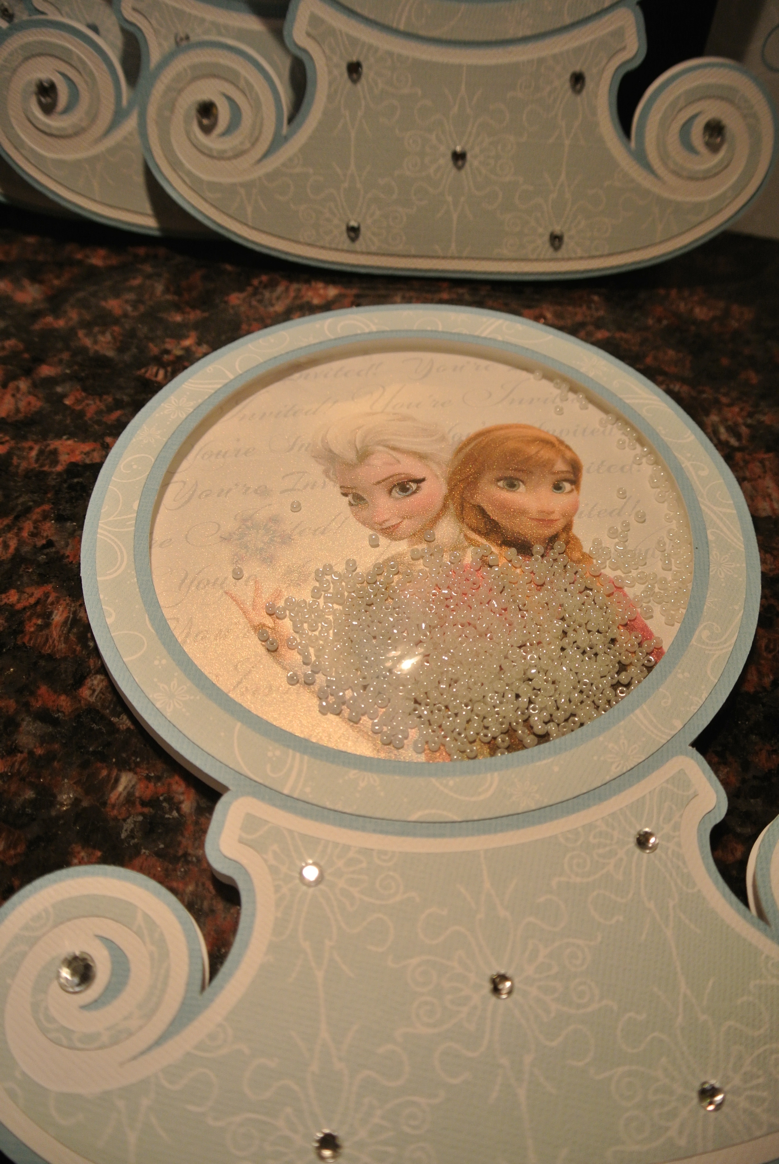I have a client who has fabulous parties for her kids and comes up with great themes. These invitations and party favors were for her daughter’s very special 5th birthday – a Frozen themed party! Such a great idea for a summer party – to cool things down. Although, when we began the designing and prep for this event, there was still snow on the ground outside of my studio. Boy, how things have changed quickly over the past few months… The invitation was a interactive snow globe – shake the beads inside for snow fun! Flip the invite over and the party information is found on the back. The 3D castle with paper dolls was used as an activity for the young girls to assemble and play with during the party. And of course, everyone needs a snow wand. I made an extra one that I keep on my desk so when my kids get out of hand – a little wave of the wand to “freeze” them.