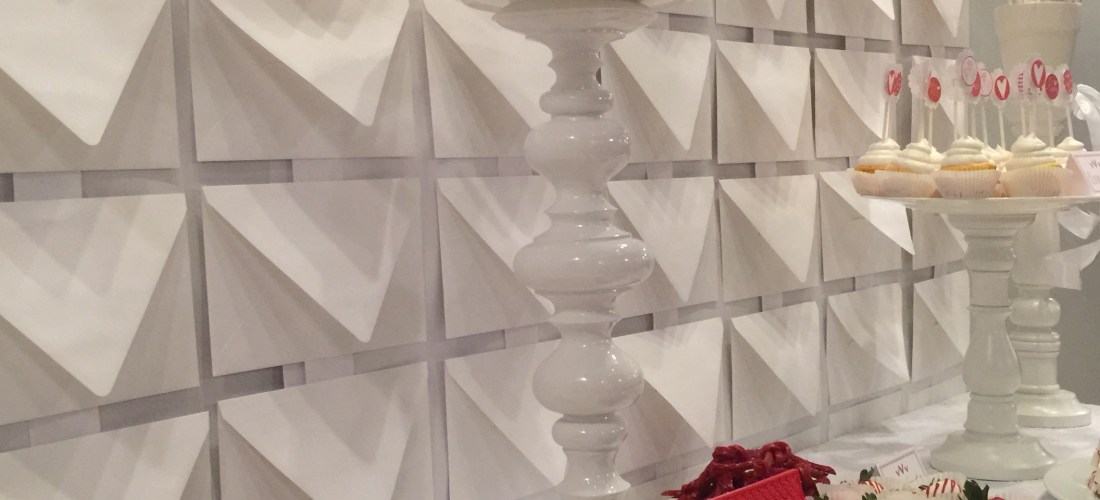 Karen had the brilliant idea of a kissing booth but to be used more like a photo booth so that guests could have photo memories and fun with their Valentine. Her giving heart wanted to be sure guests were still able to enjoy their Valentine being that the event took time from their weekend. The crape paper backdrop was created to cover an 8′ door wall. The event was at night and the wall of glass behind the booth turns into reflective mirror and wouldn’t make for good photography. The booth was a big hit!